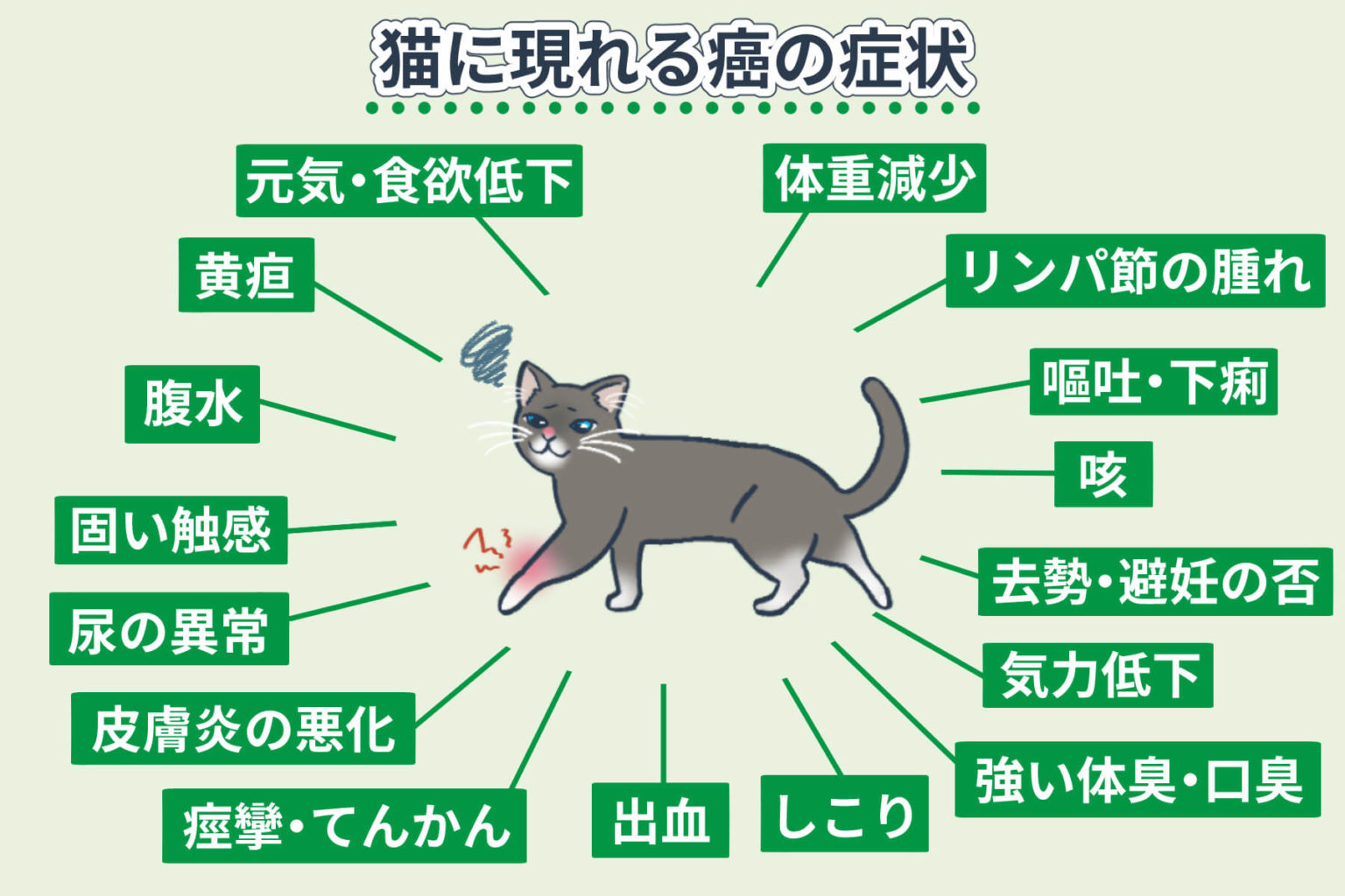 - 消化器の腫瘍:食欲低下や嘔吐などが症状に現れる。
