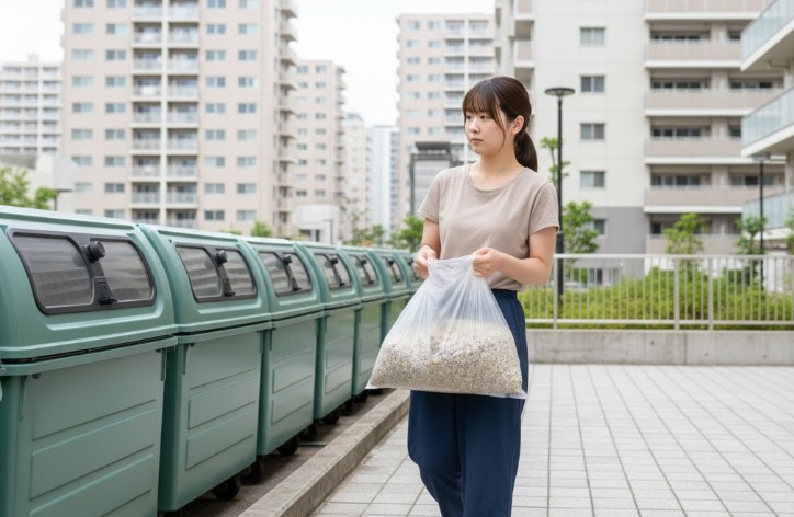 | 鉱物系 | ベントナイト | 不燃ゴミ(地域による) | ❌(絶対不可。配管詰まりの最大の原因) | 密閉すれば臭いは抑えやすい。重量に注意。 |