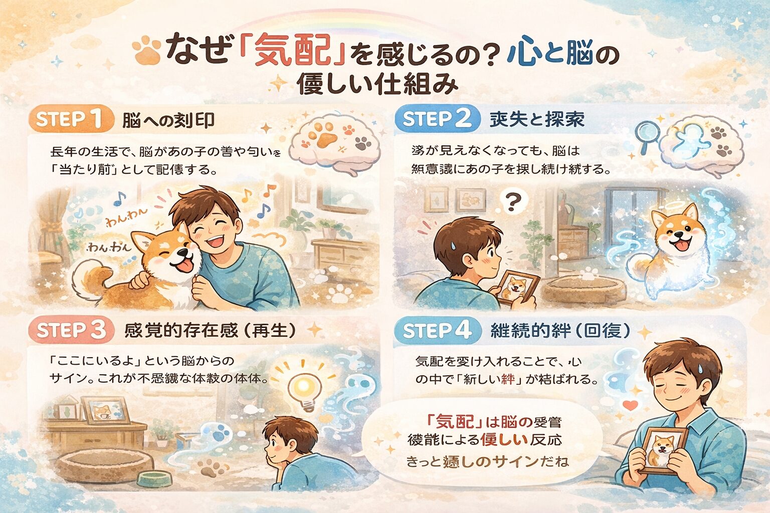 長年、愛犬と共に暮らしてきたあなたの脳には、あの子の行動パターン、足音のリズム、匂い、重みが「日常の当たり前の情報」として深く深く刻み込まれています。脳は、急激な環境の変化(愛犬の不在)にすぐには適応できません。そのため、無意識のうちに「いつもの足音」や「いつもの気配」を探し出し、脳内で再生してしまうのです。