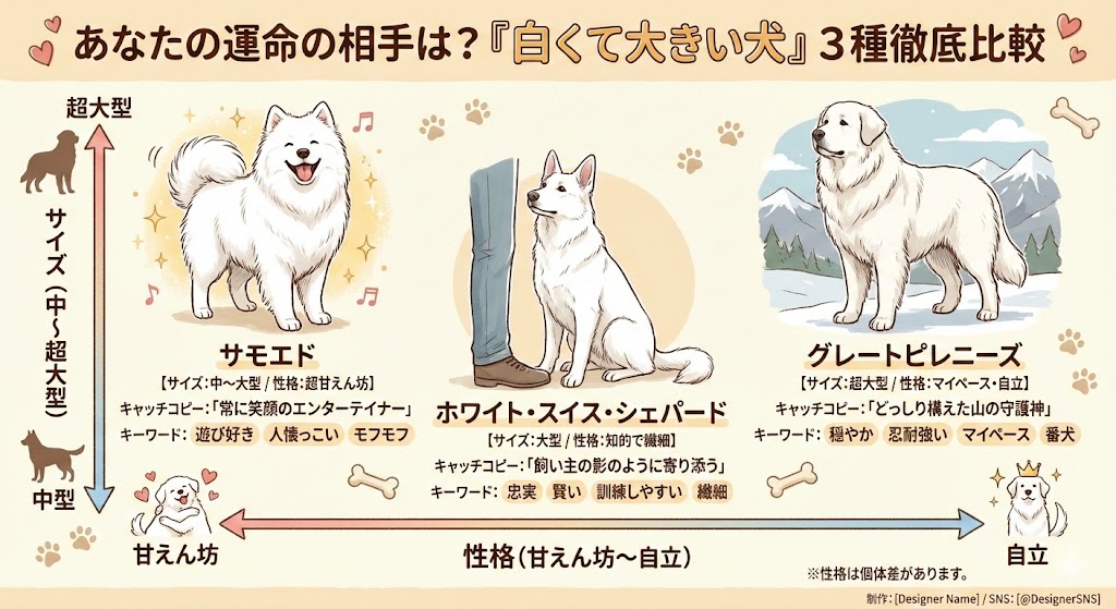 あなたがSNSで見かけた「白くて大きい犬」も、おそらく今から紹介する3つの犬種のいずれかでしょう。 サモエド、グレートピレニーズ、そしてホワイト・スイス・シェパード・ドッグ。これら3犬種は、見た目の「もふもふ感」こそ似ていますが、そのサイズ感や性格、そして飼い主への依存度には明確な違いがあります。